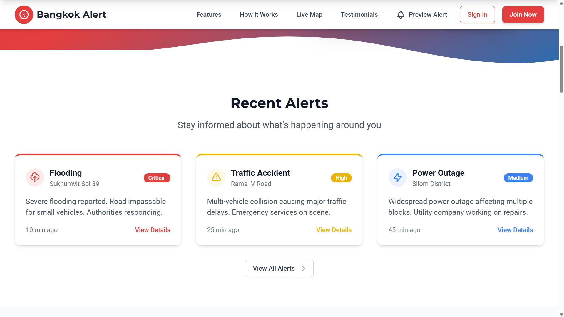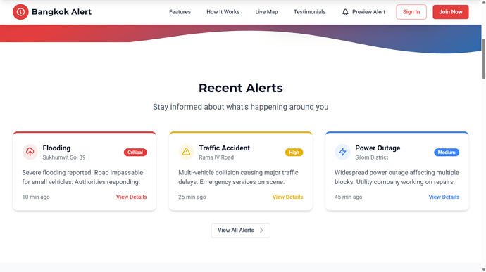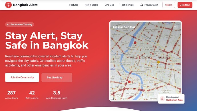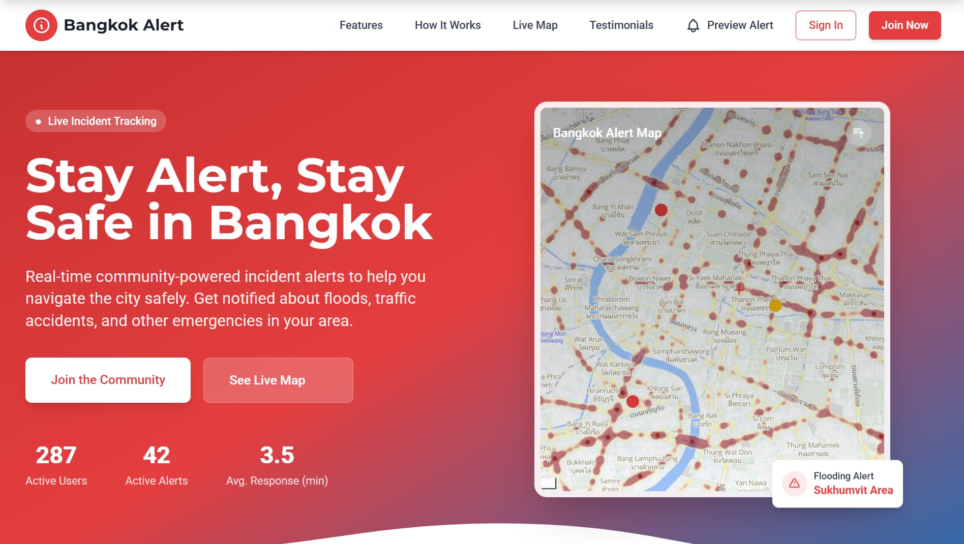 Visual Hierarchy: Large headline + clear CTAs (e.g., Join the Bangkok Alert Community Today) guide users effectively
